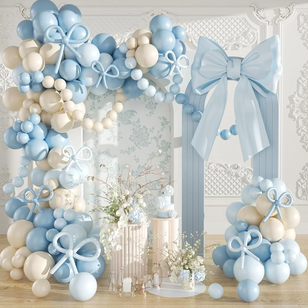 100pcs Blue Bow Long Balloons with Baby Blue, Blue & Sand White Balloons Garland Theme Set For Bow Themed Party Decoration & Celebration