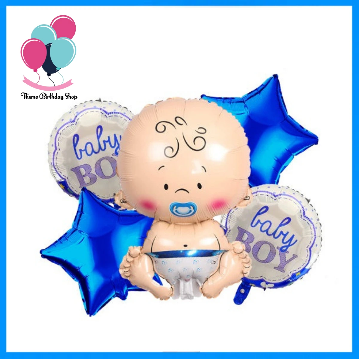 Make your baby boy’s arrival extra special with this balloon set! Includes a large baby-shaped balloon, two bright blue star balloons, and two round “Baby Boy” foil balloons — perfect for baby showers, gender reveals, or homecoming celebrations.